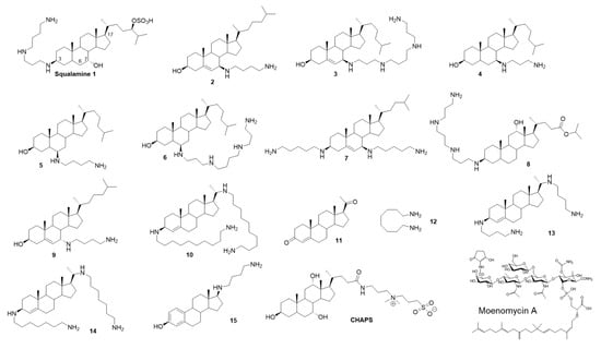Octanediamine 11 and progesterone 12 were purchased from Sigma-Aldrich (Saint Quentin Falavier, France). Squalamine 1 was prepared according to reported procedures [,]. Derivatives 2, 3 and 9 were prepared according []. Derivative 4 was prepared according []. Derivatives 10, 13 and 14 were prepared according []. Claramine A1 8 was prepared according [].
