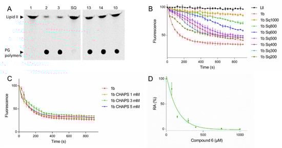 Inhibition of the GTase activity of PBP1b by squalamine and analogs. (A) TLC analysis of PG polymerase activity of PBP1b using radioactive lipid II as substrate, in the presence of squalamine and aminosterol analogs. Lanes: 1, lipid II incubated without enzyme; 2–3, lipid II incubated with 100 nM PBP1b with (2) or without (3) addition of methanol (because some compounds tested were solubilized in methanol); and SQ, 13, 14, and 10 depict the reaction incubated in the presence of 0.8 mM squalamine, or compounds 13, 14 and 10, respectively. (B) Inhibition of PBP1b GTase activity using increasing concentration of squalamine (200–1000 µM) monitored by dansyl-lipid II based continuous fluorescence assay. (C) control experiment with CHAPS (1–5 mM). (D) a representative experiment of the RA in function of compound concentrations used for the determination of IC50 values. The error bars represent the mean values ± s.d. of triplicate experiments.