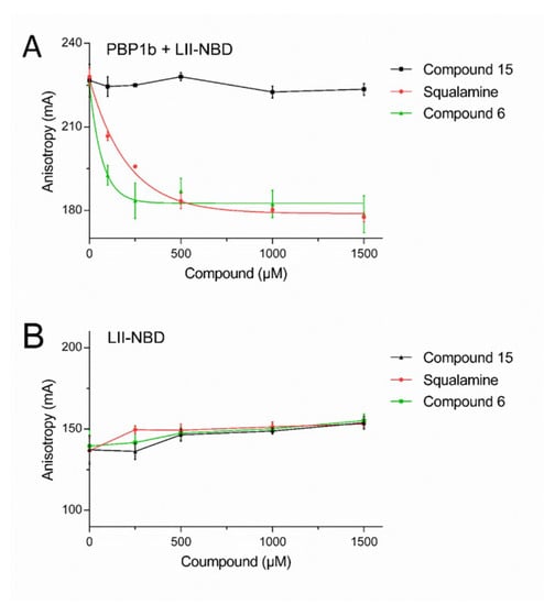 Fluorescence anisotropy assay using the NBD-lipid II as a probe. FA (in mA units) is plotted as a function of compound concentrations. The error bars represent the FA values as mean ± s.d. of triplicate experiments. (A) Competition of squalamine and compound 6 for PBP1b/NBD-lipid II binding induce a decrease of the FA of the probe while the inactive compound 15 does not affect the FA. (B) Measurements of direct binding between the probe and the compounds show no significant variation of FA, indicating absence of interactions.