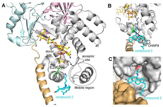 A model of the potential binding mode of compound 2 was obtained by analogy with the A. aeolicus PBP1a structure in the presence of CHAPS (Figure 4A–C) []. The steroidal part of compound 2 binds on an equivalent hydrophobic patch on PBP1b, but it is rotated and slightly shifted so that the polar chain follows the same path as the CHAPS molecule. Interestingly, the amine extremity of the polar chain is then located in close proximity (3.3 Å) of the catalytic E290 residue. This binding mode would be conserved for active compound 3 to 7 that have their polar chain at the same position as compound 2 or on the adjacent carbon and longer polar chains would reach farther into the active site. For squalamine, it is not clear if the steroidal core would be shifted or the longer polar chain would follow a different path to reach E290.