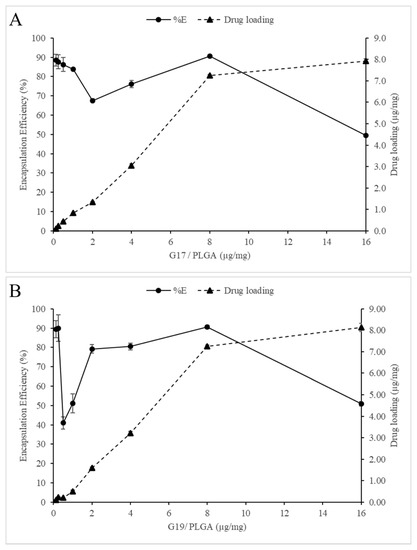 The effect of the AMP/PLGA ratio on encapsulation efficiency and peptide loading was analyzed (Figure 3); it was found that AMP-NP with either negative or positive zeta potential values is possible to avoid agglomeration, and a high encapsulation efficiency and peptide loading can be obtained (around 90%). On the other hand, at the ratio of 2 μg G17/mg PLGA and 0.5 μg G 19/mg PLGA, a low encapsulation efficiency was obtained (67 and 41%, respectively). At these ratios, the zeta potential of the nanoparticles approaches 0 mV, generating high instability of the AMP-NP. In this way, the effect of the zeta potential on the NP size and encapsulation efficiency showed similar results to those previously reported by other authors [33,34].