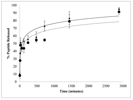 A fresh batch of nanoparticles was synthesized using the best peptide/polymer ratio (8 µg AMP/mg PLGA) for the in vitro peptide releasing profile. More than 44.0 ± 1.1% of G17 and 45.0 ± 1.1% of G19 were released in the first 60 min from these nanoparticles. Subsequently, a controlled release of these peptides was observed up to 2880 min to release most of the content of the nanoparticle (Figure 4). It is possible that a fraction of the total peptide was embedded on the nanoparticle surface, being rapidly dissociated, while the residual peptide remains inside of the nanoparticle and it is slowly released once PLGA is hydrolyzed. This releasing profile was very similar to that obtained by other authors using different active principles encapsulated [18,32,35].
