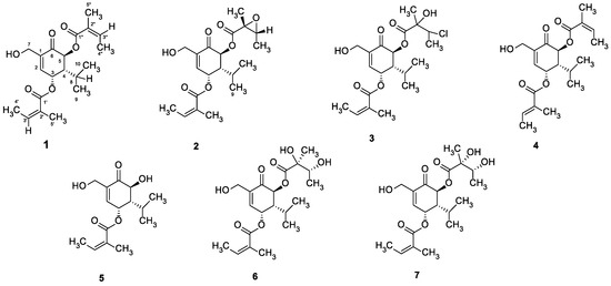 Compounds 1–7 (Figure 1) have been previously isolated from Sphaeranthus africanus L. and have shown anti-proliferative and anti-inflammatory activities in cellular models [21,22].