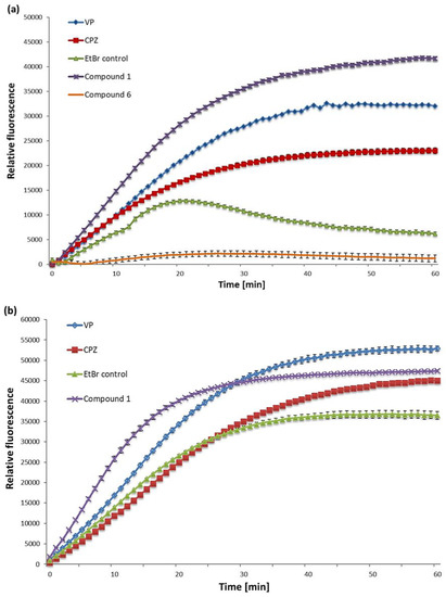 The increase of EtBr accumulation in M. smegmatis mc2 155 (a) and M. aurum ATCC 23366 (b) generated by concentrations MIC/2 of the potential efflux pump inhibitors (EPIs) 1 and 6 and the reference inhibitors, verapamil (VP) and chlorpromazine (CPZ), included as two positive controls. EtBr, the negative control, was tested at 0.5 mg/L. The curves represent means ± standard deviations (SD); n = 3.