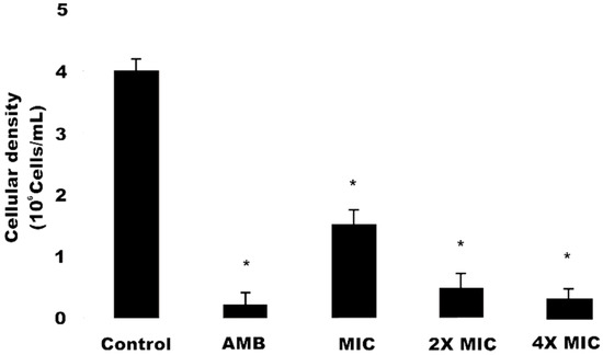 Data obtained for cell viability analysis using the Propidium Iodide (PI) marker are shown in Figure 1. C. krusei cells, when treated with OGME at different concentrations (MIC, 2MIC, 4MIC) 1.35 × 106 ± 0.04 cells, 0.64 × 106 ± 0.04 cells and 0.30 × 106 ± 0.01 cells respectively, showed a significant decrease (p < 0.05) in cell viability, in a dose-dependent manner. Amphotericin B, used as a positive control, led to a decrease in viable cells number (0.28 × 106 ± 0.02 cells) compared to the negative control, 24 h after exposure. Thus, our data corroborate the findings obtained by Da Silva et al. [29], who also observed a dose-dependent decrease in cell number, when comparing 3 naphthoquinone compounds against fluconazole-resistant C. tropicalis cells. PI is a fluorescent dye that interleaves with the DNA and RNA of cells whose plasma membrane integrity has been lost [20]. Therefore, the labeling of cells with this compound allows an analysis of the antifungal activity of OGME in biological membranes, as occurs with the action of amphotericin B [30].