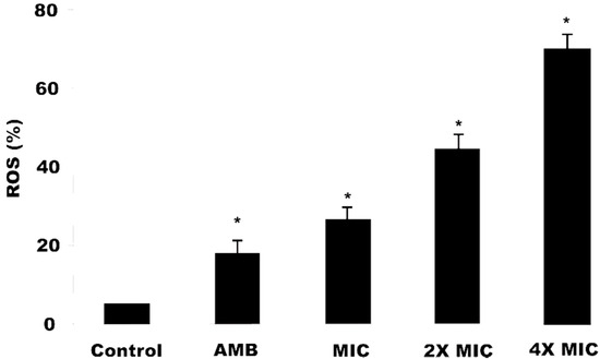 Reactive oxygen species (ROS) production in C. krusei cells after treatment with O. glomerata methanol extract. Data represent the mean and standard deviation (SD) of fluorescence during ROS production in two independent experiments with at least three replications. Analysis of variance (ANOVA) was performed followed by the Student-Newman-Keuls test (p < 0.05). * indicates significant differences between the percentage of fluorescence intensity of ROS production (p ≤ 0.05). AMB, Amphotericin B; MIC, Minimum Inhibitory Concentration; 2MIC, Double the MIC value; 4MIC, Four times the MIC value.