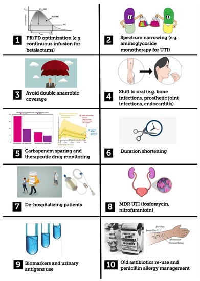 In our manuscript, we have described several clinical scenarios frequently occurring during routine clinical practice, and we have proposed targeted practical interventions to optimize antibiotic therapy. Each scenario elucidates how the main principles of AMS could be applied at a patient level. Narrowing the antibiotic spectrum (intervention 2) is the mainstay of correct antibiotic usage and, when correctly applied, has the potential to obtain clinical success while minimizing the risk of increasing resistance. It is strictly dependent on microbiological data such as a continuous monitoring of local resistance epidemiology, but also the development of methods for accurate and rapid identification of pathogens and characterization of their resistance profile [63]. Urinary antigen use could be useful for this purpose (intervention 10). Interestingly, narrowing the antibiotic spectrum can also be obtained in the management of selected uncomplicated infections caused by multi-drug-resistant (MDR) pathogens, such as ESBL or CRE urinary tract infections (intervention 9). In the setting of MDR, the re-use of old antibiotics should also be considered (intervention 12).