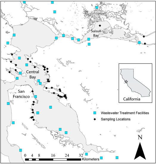 Thirty-seven near-shore sites were sampled from Central San Francisco Bay (Central Bay), and three from Suisun Bay, both sub-basins of San Francisco Bay (Figure 1). The Central Bay sites were selected using a generalized random-tessellation stratified methodology, which is a probabilistic but spatially balanced method developed to identify locations for the sampling of natural resources [50]. The Suisun Bay samples were convenience samples, employing collection methods identical to those of the Central Bay sites. Although all sites were near-shore, a variety of habitats were included in the spatial sample, including both open water and narrow channels, sites adjacent to densely populated areas (e.g., San Francisco, CA, USA; Oakland, CA, USA), and sites proximate to more sparsely populated areas (e.g., Marin County and Suisun Bay) (Figure 1) [36].