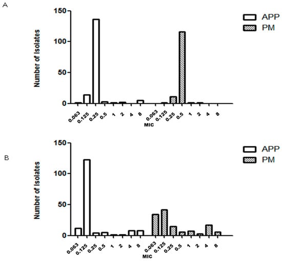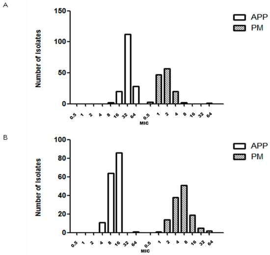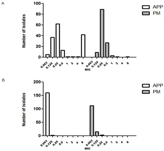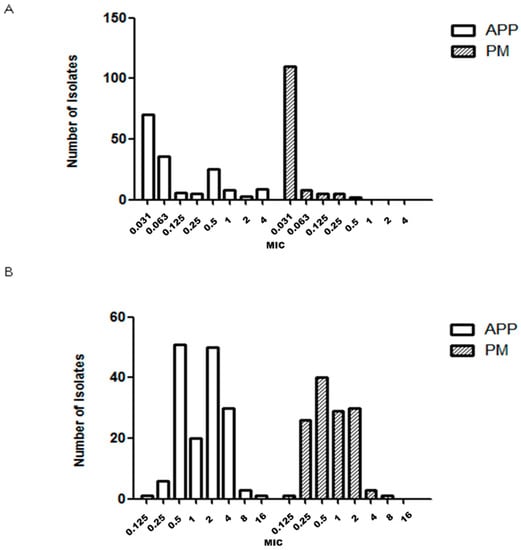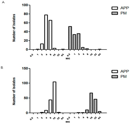 - Gutiérrez-Martín, C.B.; del Blanco, N.; Blanco, M.; Navas, J.; Rodríguez-Ferri, E.F. Changes in antimicrobial susceptibility of Actinobacillus pleuropneumoniae isolated from pigs in Spain during the last decade. Vet. Microbiol. 2006, 115, 218–222. [Google Scholar] [CrossRef]