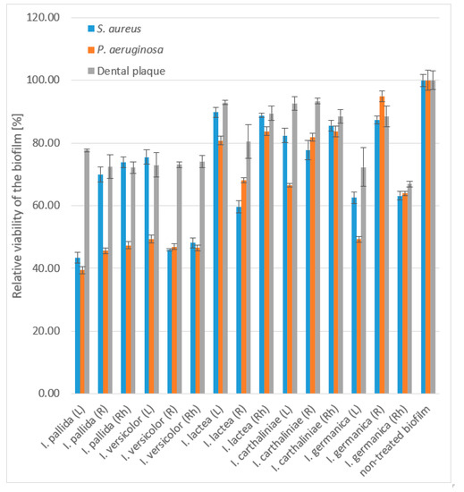 Disruption of mature biofilm by methanol extracts of Iris spp. at concentration of 666.7 mg/L. Data are presented as average of 3 repetitions with SEM. For the statistical analysis, see Supplementary Table S1.