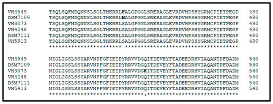 Alignment of RNA polymerase β subunit (RpoB) (residues 421–540) of six Corynebacterium urealyticum strains. Strains VH4549, DSM 7109, and VH3073 are resistant to rifampicin whereas VH4248, DSM 7111, and VH5913 are susceptible.