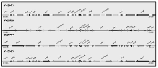 For whole genome sequencing, genomic DNAs of strains VH3073, VH4248, VH4549, VH5757, and VH5913 (selected on the basis of their resistance profile), were extracted using the NucleoSpin® Microbial DNA kit (Macherey-Nagel). Library preparation followed the NEBNext Fast DNA Fragmentation and Library Preparation Kit (New England Biolabs, Beverly, MA, USA) protocol and sequencing was performed in an Illumina HiSeq 2500 machine, at above 1000× coverage for all strains. De novo genome assembly was done with the SPAdes assembler and built-in on the PATRIC assembly server [35]. Structural and functional annotations were performed in RAST server (https://rast.nmpdr.org) [36]. Prediction of antimicrobial resistance profiles and comparative genomic analyses were performed using the bioinformatic platforms PATRIC (https://www.patricbrc.org/) [35] and EDGAR [37]. Multiple alignments were performed using T-coffee server in its variant M-coffee [38].