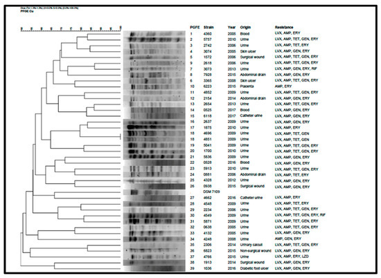 All the strains were resistant to at least two antimicrobial compounds. They presented nine different resistance profiles, the resistance combination for levofloxacin (LVX), ampicillin (AMP), gentamicin (GEN) and erythromycin (ERY) being the most prevalent (LVX-AMP-GEN-ERY = 14 isolates), as well as in combination with tetracycline (TET) resistance (LVX-AMP-GEN-ERY-TET = 13 isolates). The relationship between antibiotic resistance profiles and sample origin could not be established.