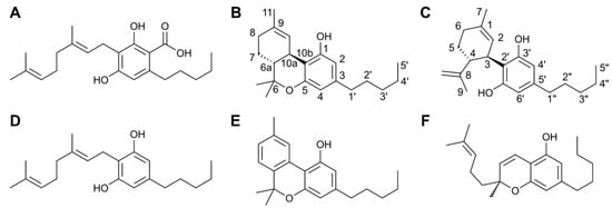 Cannabis sativa is an herbaceous plant that belongs to the family Cannabinaceae [6]. It has been used by humans for over 5,000 years for medicinal and recreational uses, firstly in Central and Northeast Asia and subsequently spreading worldwide [7]. Cannabis, or marijuana, is undoubtedly one of the most widely used illicit drugs [8]. It has a complex chemical composition that includes cannabinoids [9], which are a group of secondary metabolites, several of which are responsible for the psychotropic effects [10,11]. Metabolic fingerprinting of C. sativa unveiled more than 480 compounds, including many terpenes and approximately 180 cannabinoids [12]. Their biosynthesis involves the alkylation of olivetolic acid with geranyl diphosphate, which is catalyzed via geranyl transferase [13]. This reaction leads to the formation of cannabigerolic acid (CBGA, Figure 1A), which is a precursor molecule for numerous other cannabinoids, such as Δ9-tetrahydrocannbinol (Δ9-THC), cannabidiol (CBD), cannabigerol (CBG), cannabinol (CBN) and cannabichromene (CBC) (see Figure 1B–F) [14,15].