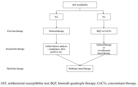 All guidelines recommend avoiding antibiotics taken by a patient previously [4,8,9,10]. In particular, reuse of clarithromycin and levofloxacin must be avoided because of the high rates of resistance. They also recommend a BQT- or levofloxacin-based triple second-line treatment regimen for H. pylori [81]. Susceptibility testing for appropriate rescue therapy should be considered if the first- or second-line therapy fails [10,81].
