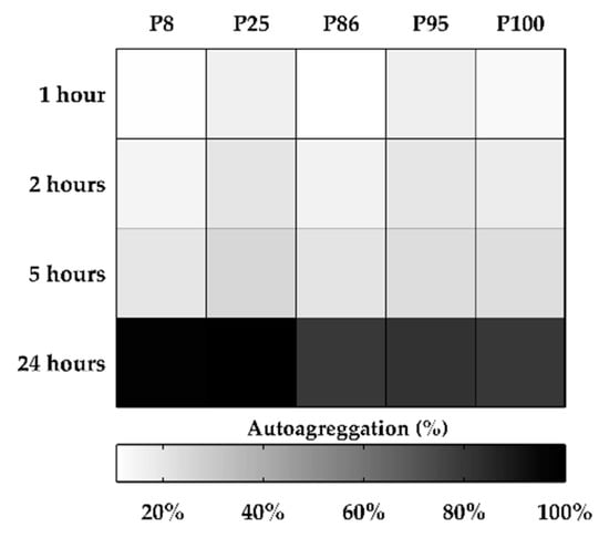 The auto-aggregation (AA%) was assessed by measuring the optical density decrease of the five Lactiplantibacilli cultures suspended in phosphate saline buffer (PBS). The analyses showed that the ability to aggregate and sediment increased progressively over time, until reaching, after 24 h, value ranges between 78.78% (P86 strain) and 99.60% (P25 strain) with significant differences among all strains. The AA results are reported graphically in Figure 2 and numerically in Table S3 (Supplementary Materials).