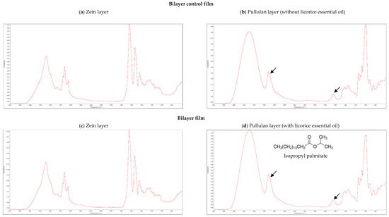 Fourier-Transform Infrared Spectroscopy (FTIR) spectra of the bilayer control film (a) zein layer, (b) pullulan layer; and bilayer film with licorice essential oil (c) zein layer, (d) pullulan layer.3.2. Microstructure of Bilayer Films.
