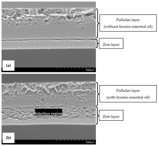 SEM micrographs of cross-sections of the designed bilayer films are presented in Figure 2, where the two layers can be distinguished. The bilayer control film (Figure 2a) exhibited an overall continuous and compact microstructure, confirming the adhesion of the two layers. The pullulan layer shows the presence of some microdroplets entrapped in the film matrix, a result of the homogenization procedure. Otherwise, the bilayer film with licorice essential oil (Figure 2b) seems to be smoother and less compacted. The presence of microdroplets is even more evident in this film, indicating the proper incorporation of licorice essential oil in the biopolymeric matrix. Moreover, the zein layer appears to be different, probably because of chemical interactions that occur between the essential oil and zein molecules via hydrogen bonds in the interface region (highlighted in Figure 2b) of both layers of the film, presenting high essential oil concentration, as it was reported earlier by other authors [5]. This interface region between the two layers of the film with licorice essential oil suggests the potential migration of the essential oil from the pullulan layer (more hydrophilic) to the zein layer (more hydrophobic), which was not verified by FTIR analysis, as mentioned above. To avoid the formation of this interface region, the bilayer films incorporating licorice essential oil may be subjected to calendaring molding with a combination of temperature and pressure, which may negatively impact their general physical properties [21].