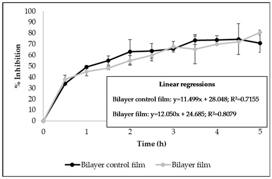 The antioxidant activity of bilayer films developed in this work was studied using the DPPH free radical scavenging assay and the β-carotene bleaching test. Figure 3 shows the results of the DPPH assay, presented as Percentage Inhibition measured over time (5 h). It was verified that control bilayer films and the ones incorporating licorice essential oil presented similar radical scavenging activity (Figure 3), indicating that the addition of the essential oil did not increase that activity. Due to its chemical structure, zein has great potential for use in food packaging because of its intrinsic antioxidant nature, allowing zein-based films to have antioxidant activity without adding any antioxidant during processing [37]. It was also verified by the linear regressions that the ability of the films to scavenge the DPPH free radicals occurs in a time-dependent manner (R2 > 0.7) (Figure 3).