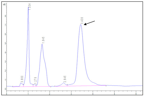 Firstly, a HPLC-DAD method was developed to identify and quantify isopropyl palmitate. Figure 4 shows an example of a chromatogram obtained during the assays, highlighting the peak corresponding to the compound at 3.436 min.