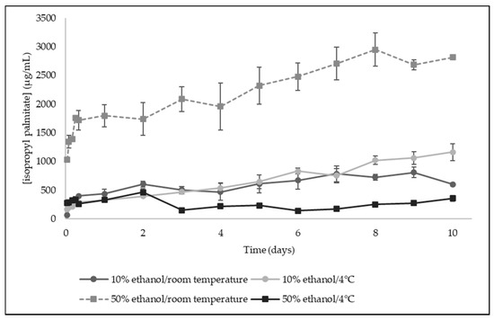 Release kinetics of isopropyl palmitate from bilayer films to food simulants (10% ethanol and 50% ethanol) at room temperature and 4 °C (Results expressed as mean ± SD).
