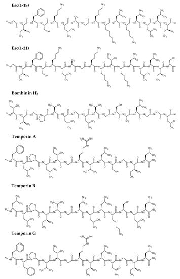 - Islas-Rodriguez, A.E.; Marcellini, L.; Orioni, B.; Barra, D.; Stella, L.; Mangoni, M.L. Esculentin 1-21: a linear antimicrobial peptide from frog skin with inhibitory effect on bovine mastitis-causing bacteria. J. Pept. Sci. 2009, 15, 607–614. [Google Scholar] [CrossRef]