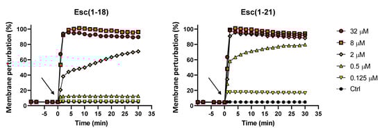 Esculentin peptides are known to display an antibacterial activity mainly through a membrane-perturbing mechanism of action. To verify their ability to perturb the cytoplasmic membrane of Gram-positive bacteria, such as C. jeikeium, a Sytox Green assay was performed. Sytox Green is a fluorescent probe unable to cross intact membranes, and its fluorescence intensity significantly increases upon binding to nucleic acids. As shown in Figure 2, the rapid increase of the fluorescent signal immediately after peptide addition to the bacterial cells (arrow) indicated that the perturbation of the membrane was the result of the peptide-induced membrane damage, allowing the internalization of the probe with a consequent binding to the bacterial DNA. Both esculentin AMPs manifested a dose-dependent fast kinetic membrane destabilization with a total perturbation of the phospholipid bilayer already within the first minutes of treatment at the highest concentration of 32 µM. According to the MIC and MBC values, the most active Esc(1-21) exhibited a stronger effect compared to Esc(1-18), even at a concentration as low as 0.5 µM with about 60% membrane damage within the first 2 min.