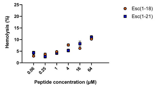 To evaluate the potential cytotoxicity of esculentin peptides in the short term, they were tested for the ability to lyse mammalian red blood cells after 40 min of treatment at 37 °C. Both AMPs caused a weak and similar hemolysis with an ~10% release of hemoglobin at a concentration of 64 µM, which is significantly higher than the antimicrobial dosages, thus suggesting their safety profile for short-term treatment (Figure 3).