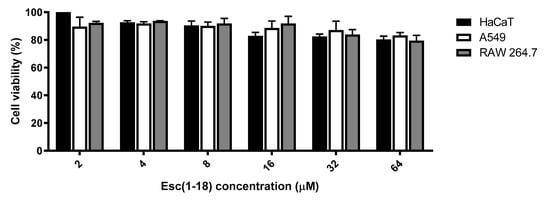 Dose-dependent effect of Esc(1-18) at different concentrations on the viability of HaCaT, A549, and RAW 264.7 cell lines after 24 h of treatment. The percentage of metabolically-active cells compared to untreated control samples is reported on the Y-axis. All data are the mean of three independent experiments ± SEM.