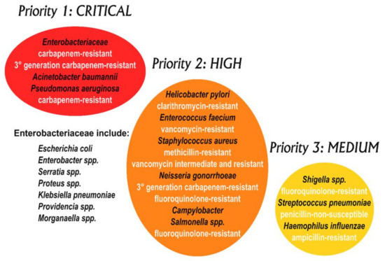 - Tacconelli, E.; Magrini, M. Global Priority List of Antibiotic-Resistant Bacteria to Guide Research, Discovery, and Development of New Antibiotics. Available online: www.who.int/medicines/publications/WHO-PPL-Short_Summary_25Feb-ET_NM_WHO (accessed on 9 June 2020).