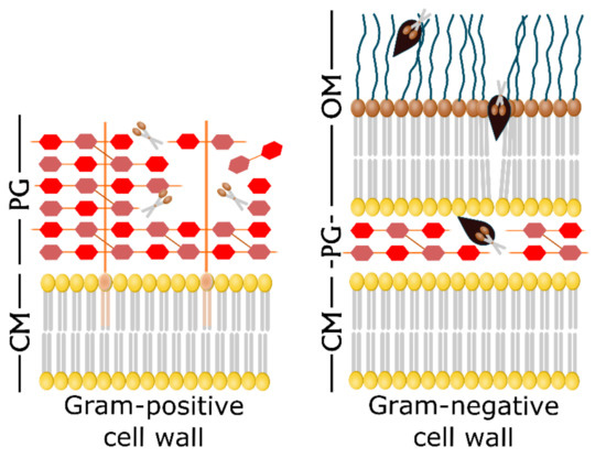 Exogenous addition of endolysins and Artilysin®s against the bacterial cell wall. The Gram-positive cell wall is directly accessible to exogenous endolysins (scissors) that cleave the peptidoglycan (PG) bonds, leading to the cell lysis (left panel). On the contrary, natural endolysins are not able to pass through the outer membrane (OM) of Gram-negative cells to attack the PG layers. Artilysin®s are engineered enzymes with an additional LPS-destabilizing peptide (black) that enables the endolysin to reach the PG and cleave it (right panel). Adapted from [54].