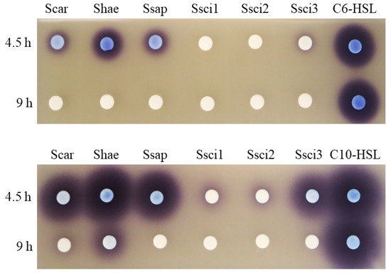 Six strains from four CNS species, Staphylococcus carnosus, Staphylococcus haemolyticus, Staphylococcus saprophyticus, and Staphylococcus sciuri were selected to evaluate their AHL-degrading activities. CNS strains were cultivated in Luria–Bertani (LB) liquid medium containing 20 μM N-hexanoyl-l-homoserine lactone (C6-HSL) or N-decanoyl-l-homoserine lactone (C10-HSL). After 4.5 and 9 h incubation, the remaining AHLs in the culture supernatant were visualized by AHL biosensors, Chromobacterium violaceum CV026 (for the short chain C6-HSL) and VIR07 (for the long chain C10-HSL), which produced the purple pigment violacein [13,14]. The results of AHL degradation are shown in Figure 1. All CNS strains used in this study completely degraded 20 μM C6-HSL by 9 h incubation, confirming their C6-HSL-degrading activities. Specifically, S. sciuri ATCC 29060 and 29061 completely degraded 20 μM C6-HSL by 4.5 h incubation, suggesting higher AHL-degrading activities than those of other strains. In contrast, most C10-HSL remained by 4.5 h incubation in the supernatants of S. carnosus, S. haemolyticus, and S. saprophyticus. Lower levels of C10-HSL were detected in the culture supernatants of S. sciuri ATCC 29060 and 29061, which also had higher C6-HSL-degrading activities. After 9 h incubation, all CNS strains completely degraded 20 µM C10-HSL except for S. haemolyticus NBRC 109768. These results suggested that the CNS strains tested in this study had higher degrading activities toward C6-HSL than C10-HSL.