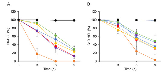 Degradation of C6-HSL (A) and C10-HSL (B) by Escherichia coli DH5α harboring ahlS genes from the CNS strains. Full-grown cultures of E. coli DH5α harboring an empty vector pBBR1MCS5 (black) or pBBR1MCS5 containing the ahlS gene from S. carnosus NBRC 109622 (blue), S. haemolyticus NBRC 109768 (orange), S. saprophyticus NBRC 102446 (red), S. sciuri ATCC 29060 (yellow), S. sciuri 29061 (purple), and S. sciuri StLB252 (green) were inoculated into the Luria–Bertani (LB) medium containing 10 μM C6-HSL or C10-HSL and incubated at 37 °C for 3, 6, and 9 h. After incubation, the remaining AHLs in the culture supernatants were visualized by C. violaceum and calculated using the relationship equations based on the size of the purple-color zones. The data were reproduced at least three times and the error bars indicate standard deviations.
