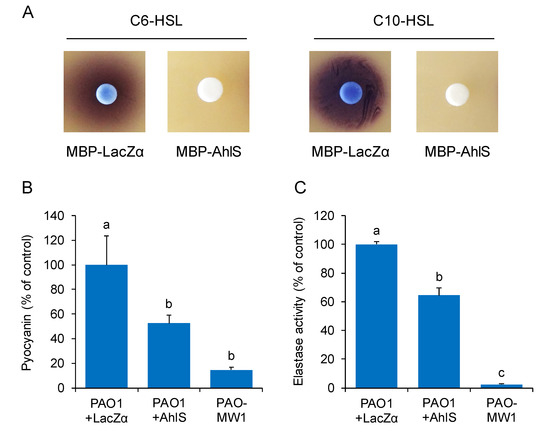 P. aeruginosa is an opportunistic pathogen that uses the quorum-sensing system to regulate several virulence factors [18]. In P. aeruginosa PAO1, LasI and RhlI are responsible for the synthesis of the las and rhl signals, N-(3-oxododecanoyl)-l-homoserine lactone (3-oxo-C12-HSL) and N-butyryl-l-homoserine lactone (C4-HSL), respectively [18]. Pyocyanin, which is a redox-active phenazine pigment and induces cytotoxicity in human cells [19], is produced by P. aeruginosa in response to AHL-mediated quorum sensing [18]. Elastase, a major virulence factor in P. aeruginosa that degrades tissue matrix proteins in the human host, is also regulated by the quorum-sensing system [18]. Pyocyanin production and elastase activity were drastically reduced in the lasI rhlI double mutant P. aeruginosa PAO-MW1 (Figure 4B,C). Assessment of the effect of MBP-AhlS on quorum sensing in P. aeruginosa showed that the pyocyanin production by P. aeruginosa PAO1 treated with MBP-AhlS was reduced to less than 50% of that with the control MBP-LacZα (Figure 4B). The elastase activity in P. aeruginosa PAO1 treated with MBP-AhlS was reduced to 60% of that with MBP-LacZα (Figure 4C). These results demonstrated that treatment by AhlS contributed to reducing the production of several virulence factors regulated by AHL-mediated quorum sensing in P. aeruginosa.