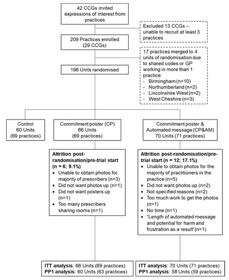 In December 2015, practices were randomly allocated to control, Commitment Poster (CP), or CP and automated message (CP&AM) groups, stratified by CCG as follows. Each practice, within each CCG, was randomly assigned a number between 0 and 1. The first 40% of practices occurring numerically in the list were allocated to the control, and approximately 30% were allocated to CP and CP&AM respectively thereafter. Quotas were selected based on the number of participating practices per CCG to ensure close to a numerical balance in the number of practices assigned. In total, 17 practices were combined into 2 groups of 2, 1 group of 3, and 1 group of 10 for randomization due to co-located prescribers or shared consulting rooms. Prescribers and researchers were not blinded to trial arm allocation because of the nature of this behavioral intervention.