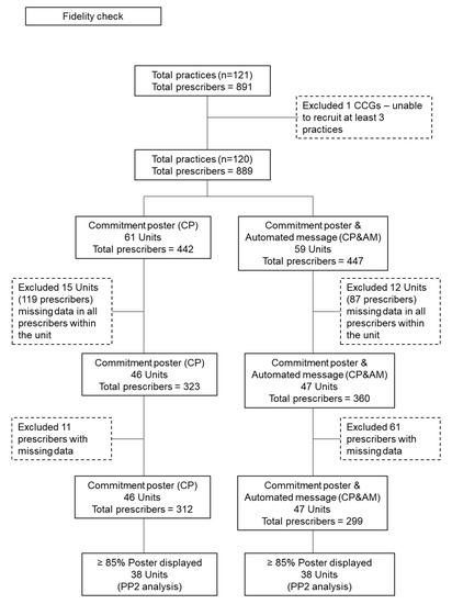 Figure 2 describes the responses to poster fidelity checks for the 889 participating GPs in the two trial arms. In total, 15 (CP) and 12 (CP&AM) practice units did not respond to poster fidelity checks, representing missing data for 119 and 87 prescribers, respectively. Of the practice units responding, a further 11 (CP) and 61 (CP&AM) prescribers were reportedly not displaying the posters.