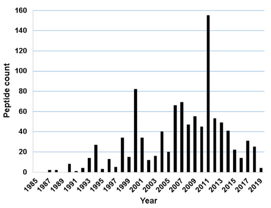 Frog antimicrobial peptides discovered annually from 1985 to 2019. Data in all the figures presented in this study were obtained from the Antimicrobial Peptide Database (http://aps.unmc.edu/AP) in June 2020.