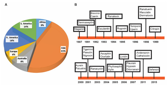 (A) Percentages of amphibian antimicrobial peptides discovered on different continents based on the APD (http://aps.unmc.edu/AP) as of June 2020; (B) Discovery timeline for major amphibian antimicrobial peptide families.
