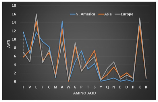 Variation in the amino acid signatures of brevinin peptides discovered in three regions: 152 from Asia, 20 from Europe and 48 from North America. The dotted vertical line indicates the maximal difference between two groups. Data from the APD as of June 2020 [78].