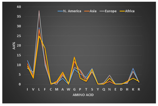 Variation in the amino acid signatures of temporins discovered in four regions: 5 from Africa, 66 from Asia, 20 from Europe and 30 from North America. The dotted vertical line indicates the maximal difference between two groups. Data from the APD as of June 2020 [78].