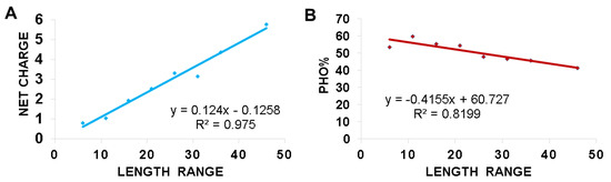 The change in the amino acid signatures for AMPs with different lengths (brevinin vs. temporins) (Figure 3 and Figure 4) prompted us to investigate the factors that connect different frog peptide families. We reasoned that frog AMPs would be ideal for this study since (1) there is a large number (over 1000) in the APD and (2) they are relatively homogenous in sequence, usually forming an amphipathic helix [4,5,6,7,8,9,10,11,12]. To get insight into the length-dependent design of frog AMPs, we separated these peptides into numerous length groups at a step size of five (e.g., 6–10, 11–15, 16–20, 21–25, 26–30, 31–35, 36–40, 41–45, and 46–50). The last group is 46–50 because 99.9% of these frog AMPs in the APD have a peptide length less than 50 amino acids. We excluded the 41–45 length group from this analysis because it is a small group with only four peptides and contains the only two frog defensins, which are drastically different from linear helical peptides. The averaged net charge and hydrophobic content for each group of frog AMPs were then calculated by using the database statistical analysis after each peptide search [80]. In the APD, the hydrophobic content (Pho) is the sum of the percentages for leucine, isoleucine, valine, methionine, alanine, cysteine, phenylalanine, and tryptophan. Figure 5 shows the charge-length and Pho-length plots. With an increase in peptide length, we observed a proportional increase in peptide net charge (Figure 5A). On contrary, the hydrophobic content decreased with an increase in peptide length (Figure 5B). In other words, longer frog peptides tend to have more charged amino acids at the expense of hydrophobic amino acids. To illustrate, the long frog peptides in the APD are mostly esculentins with 46–49 amino acids, an averaged net charge of +5.8 and a hydrophobic content of 41.5%. On the opposite side, the short peptides with 11–15 amino acids are mostly temporins and aureins with an average peptide length of 13.2, hydrophobic content of 59.8% and net charge of +1.0.