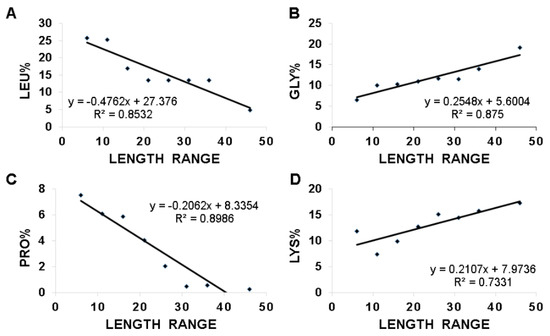 We then asked which amino acids are proportionally changed with peptide length, leading to the linear correlations in Figure 5. For this purpose, we also calculated the average amino acid contents for each amino acid in the different length groups at the same step size of 5. We scanned through the plots of the residue content versus peptide lengths for all the 20 amino acids. The top four amino acids that displayed a linear relationship are plotted in Figure 6. They are (A) leucine; (B) glycine; (C) proline; and (D) lysine, three of which are the frequently occurring amino acids of frog AMPs mentioned above. This is interesting considering leucine, glycine, and lysine are sufficient to design active peptides [39]. While both glycine and lysine are proportional to peptide length, leucine and proline are inversely proportional to peptide length. The correlation coefficients (R2) for these four plots are in the range of 0.73–0.90 (Figure 6), indicating a linear relationship. Moreover, phenylalanine shares a similar inverse relationship with leucine, although the correlation coefficient is 0.62 (not shown). The next amino acid with a correlation coefficient greater than 0.5 is cysteine. The rest of the amino acids are less correlated with R2 ranging from 0.009 to 0.45. It is likely that the decrease in proline in longer peptides is to retain the helical structure required for peptide function. We propose that these linear relationships uncovered herein in Figure 5 and Figure 6 might be utilized to design new linear peptides at different lengths. To illustrate this, we analyzed 62 dermaseptins (DRS), one family of amphibian peptides discovered mostly in South America [5]. These peptides were separated into three length groups (21–25, 26–30, 31–35 amino acids) and the features of each group are listed in Table 4. It is remarkable that there is a proportional increase of alanine, lysine, and net charge with peptide length, while leucine and glycine are inversely proportioned to peptide length in dermaseptins. These relationships are essentially the same as we found above based on all frog peptides. The only exception is glycine. This may result from the abundance of a small alanine, which can be regarded as an analog of glycine (Table 3). Indeed, many dermaseptins start with either the GLW or ALW sequence motif. W3 is a highly conserved aromatic residue in dermaseptins, facilitating peptide quantification by UV [5]. Our analysis here in Table 4 uncovers the design parameters of dermaseptins at various length groups, yielding novel insight into these amphibian peptides.