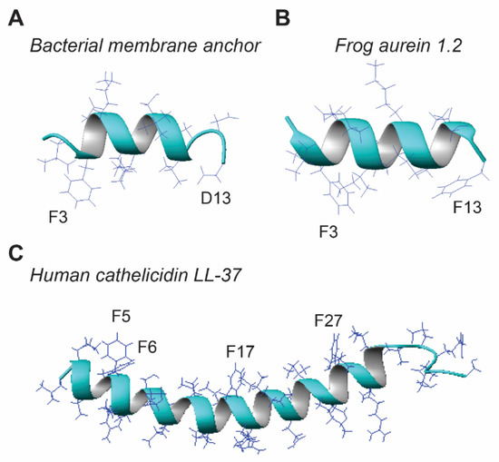 Once the peptide length is decided, both hydrophobic and cationic amino acids are considered to generate the popular amphipathic sequences of amphibian AMPs [4,5,6,7,8,9,10,11,12]. Our recent analysis of all the AMPs in the APD uncovered a linear relationship of the peptide hydrophobic content (Pho) with the percentage of arginine, but not lysine [126]. However, there is a clear linear relationship between lysine and Pho when Pho is below 50% in the plot. We found here different requirements for hydrophobic contents depending on the bacterial Gram type. The hydrophobic content is higher for AMPs against Gram-positive bacteria than Gram-negative bacteria (Table 3). Leucine is a frequently occurring hydrophobic amino acid that can be used to represent all hydrophobic amino acids. In addition, phenylalanine (Phe) appears to be an important aromatic residue to anchor such peptides onto membranes. In several cases (Figure 7), we have demonstrated direct magnetic dipole–dipole interactions between aromatic rings of Phe and anionic phophatidylglycerol (PG) [65,136,141]. This may explain why Phe increases with a decrease in peptide length in helical peptides [129]. A typical example is temporin-SHf (sequence: FFFLSRIF) [142], an eight residue peptide with 50% Phe. The four Phe residues in this natural frog peptide are reminiscent of human cathelicidin LL-37. The four Phe aromatic rings (F5, F6, F17, and F27) of LL-37 (Figure 7C), as well as arginine, all interact with anionic lipid PG [136]. Such features are remarkably conserved in temporin-SHf, making it a minimal LL-37 like peptide. In contrast, the averaged net charge is slightly higher for peptides active against only Gram-negative bacteria than those against Gram-positive bacteria. This basic amino acid is usually lysine in frog peptides. That explains why lysine can be utilized to represent basic amino acids in amphibian AMPs in general. This database observation is in line with our results obtained from the structure–activity relationship study of a broad-spectrum helical peptide GF-17, the major antibacterial peptide of LL-37 [127]. A decrease in peptide hydrophobicity by disrupting the helical backbone or by sequence truncation eliminated its activity against Gram-positive S. aureus but not Gram-negative E. coli. However, conversion of three arginines to alanines in 17BIPHE2 (a stable, selective and potent peptide designed based on GF-17) made the peptide active against S. aureus but not E. coli [128,143]. Hence, the ratio between hydrophobic and charged amino acids is a determinant of the peptide activity spectrum (Table 3). These results may open the door to engineering peptides with a desired activity spectrum to selectively eliminate the unwanted pathogens with no harm to commensal bacteria.