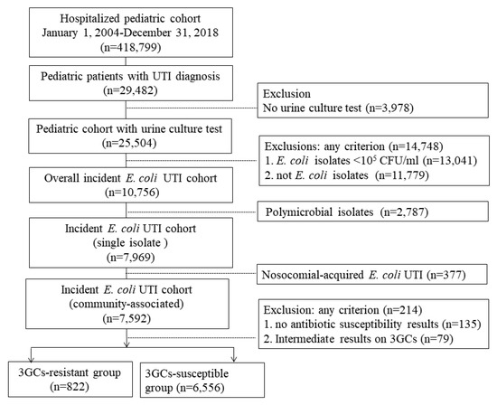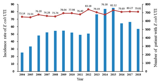 The primary study outcome was the annual incidence of E. coli isolates in CA-UTIs among hospitalized children. Following current guidelines and the previous literature for community UTIs [12,16], an episode of UTI was defined as the presence of the following: (1) a discharge diagnosis of UTI, using the International Statistical Classification of Diseases and Related Health Problems codes (2004–2016: Ninth Revision (ICD-9); 2017–2018: Tenth Revision (ICD-10)) (Supplementary Materials Table S1) [10] and (2) a urine culture having more than 1 × 105 colony-forming units (CFU) per mL of bacteria with a single uropathogen isolated to ascertain the associated burden [23]. To avoid over counting by including prior infections (e.g., recurrent UTI), only the first hospitalization (including transferred from emergency department and outpatient visit) for a UTI during the study duration was included (as the index hospitalization). Because antibiotic susceptibilities generally take approximately 3 days to report the resistant bacteria in the study setting, CA-UTIs were defined by the earliest urine culture specimen result reported within 4 days after the admission date of index hospitalization (approximately, urine samples collected within first 24–48 h after hospitalization). Children having a sample of urine culture during the index hospitalization (>4 days after the admission date or ≤3 days after discharge date) were considered to have healthcare-associated UTIs [24].