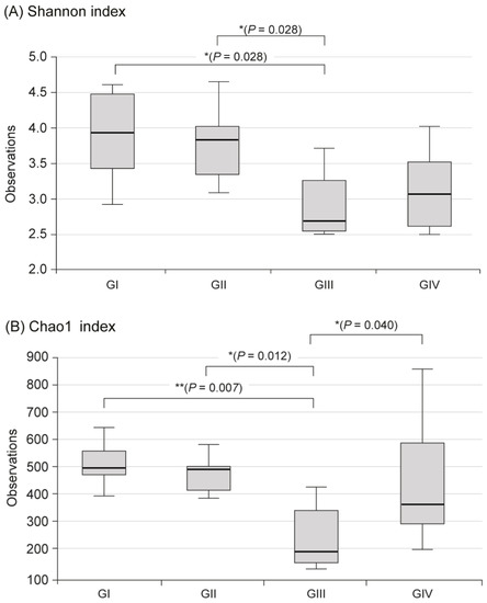 The EzBioCloud 16S rRNA database (https://www.ezbiocloud.net) operated by ChunLab (ChunLab, Inc., Seoul, Korea) was used as a bioinformatics cloud platform for accurate pairwise and taxonomic assignments. Chimeric reads were filtered on reads with <97% similarity based on the UCHIME algorithm [33], and operational taxonomic units (OTU)s with single and un-clustered reads are omitted from further analysis. Alpha diversity, which measures the diversity and abundance of bacterial species, was analyzed by the Shannon and Chao1 index. As for diversity, it is necessary to take into account not only qualitative amounts of species but also the abundance of species. Shannon index measures the number of different species per sample defined as abundance. In addition, the Chao 1 index qualitatively measures alpha diversity, giving more weight to rare species [34]. The Wilcoxon rank-sum test was used to examine differences in the number of OTUs. Beta diversity shows a compositional difference between microbial communities, and it was measured using the unweighted UniFrac method. The results were presented by PCoA, it was visualized as a two-dimensional scatter plot to reveal the microbial compositional differences between samples [35].