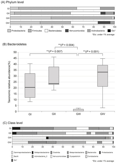 In the metagenomic analysis of S-GM, changes in the diversity and abundance of stool microbiome were identified (Table 2). Alpha diversity was the lowest in the standard triple therapy group (group III). The Shannon and Chao1 indexes were relatively preserved in the S-GM therapy group (group IV) compared with those in the standard triple therapy group (group III vs. group IV, Shannon index, 2.92 ± 0.53 vs. 3.13 ± 0.55; Chao 1, 245.71 ± 121.23 vs. 440.45 ± 213.56). The abundance in group III decreased significantly, while in group IV it was preserved with a similar trend to group II (Figure 1). Focusing on changes in each species, the composition of the stool microbial community was analyzed at the phylum and the class levels. In the phylum level, the amount of Bacteroidetes was significantly reduced, summation of two phyla Proteobacteria and Firmicutes took up above 95% in group III, and qualitative amounts of other phyla showed a decrease. While in group IV, total microbiota composition was evenly preserved, and taxonomic relative abundance presented as similar to the non-antibiotic treated groups (group II). Analogous trends were observed in the analysis of microbiomes with class level. In group III, diversity of class was prominent by only two types of Gammaproteobacteria and Clostridia, while group IV continued to have similar abundant diversity to group I and group II (Figure 2).