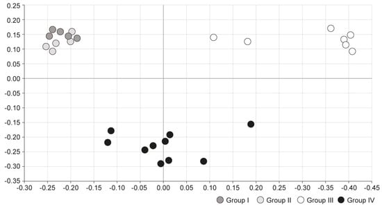 Principal coordinates analysis (PCoA) was conducted to compare microbial communities between the four groups. In PCoA analysis, points that are closer together represent microbial communities that are more similar in sequence composition. Group I and II showed similar trends, whereas group III showed a distinctly different trend of microbiome composition. Group IV, which was treated with S-GM therapy, showed moderate disposition (Figure 3).
