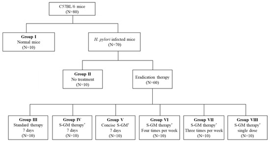 Flow chart for study design. * S-GM therapy, amoxicillin (14.25 mg/kg), gentamicin-intercalated smectite hybrid (S-GM) which emitted 8 mg/kg of gentamicin and omeprazole (138 mg/kg); † Concise S-GM therapy, gentamicin-intercalated smectite hybrid (S-GM) which emitted 8 mg/kg of gentamicin and omeprazole (138 mg/kg).