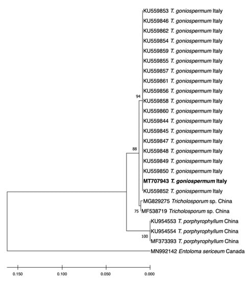 Maximum-likelihood (Tamura-Nei model) tree showing the phylogenetic position of the Tricholosporum goniospermum PeruMyc2084 isolate used in this study (corresponding to MT707943). We used sequences representing different Tricholosporum species and T. goniospermum samples. Both GenBank accession numbers and geographical origins are reported. Bootstrap values (expressed as percentages of 1000 replications) are shown at branch points.
