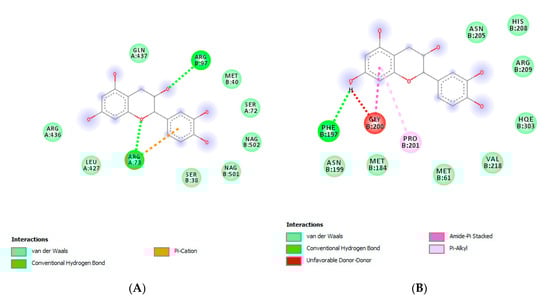 Putative interaction between catechin and human tyrosinase-related protein 1 (PDB: 5M8P). The free energy of binding (ΔG) and affinity (Ki) are −6.7 kcal/mol and 12.4 µM, respectively (A). Putative interaction between catechin and tyrosinase from Bacillus megaterium (PDB: 5I3B). The free energy of binding (ΔG) and affinity (Ki) are −6.6 kcal/mol and 14.7 µM, respectively (B).